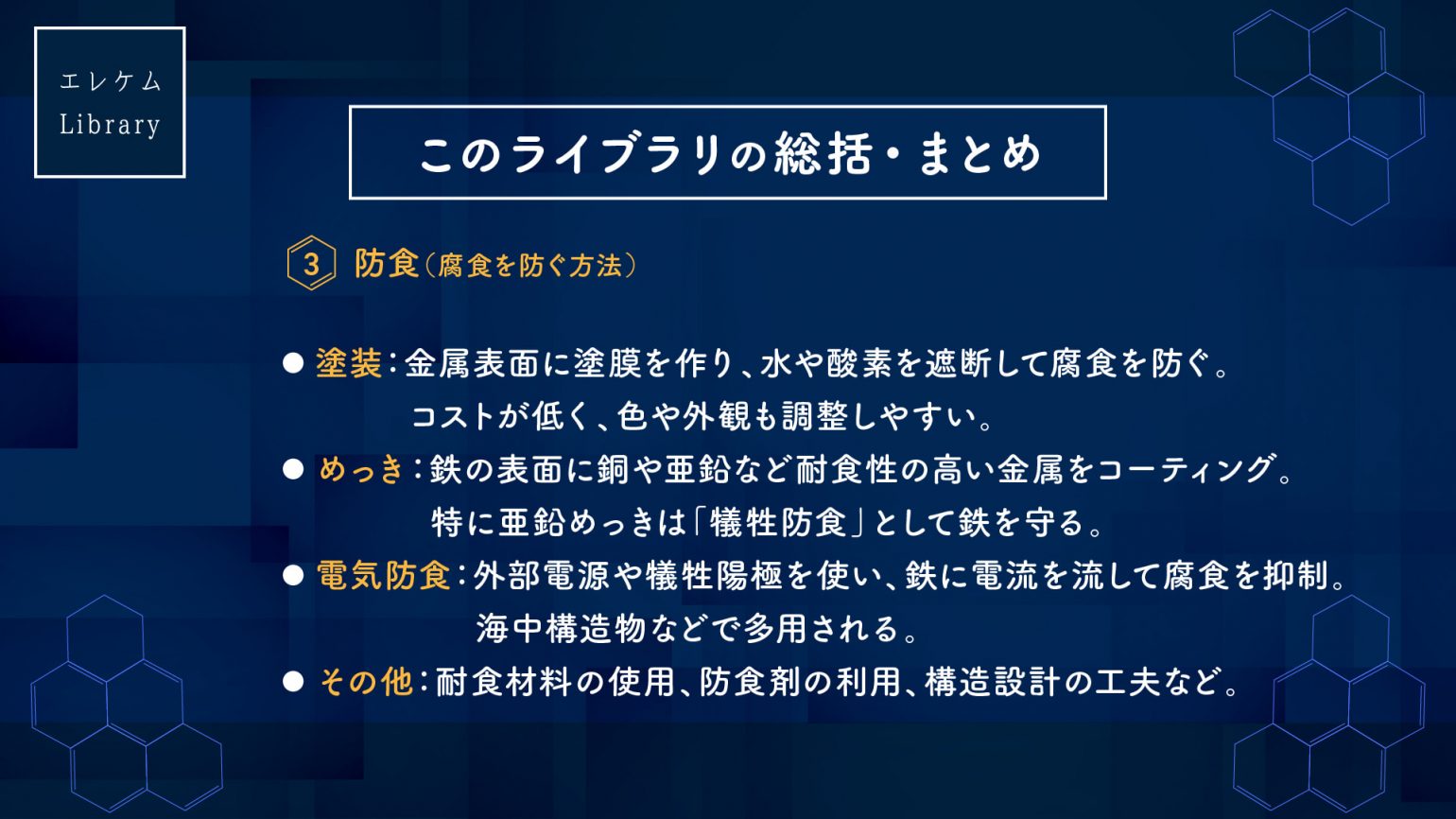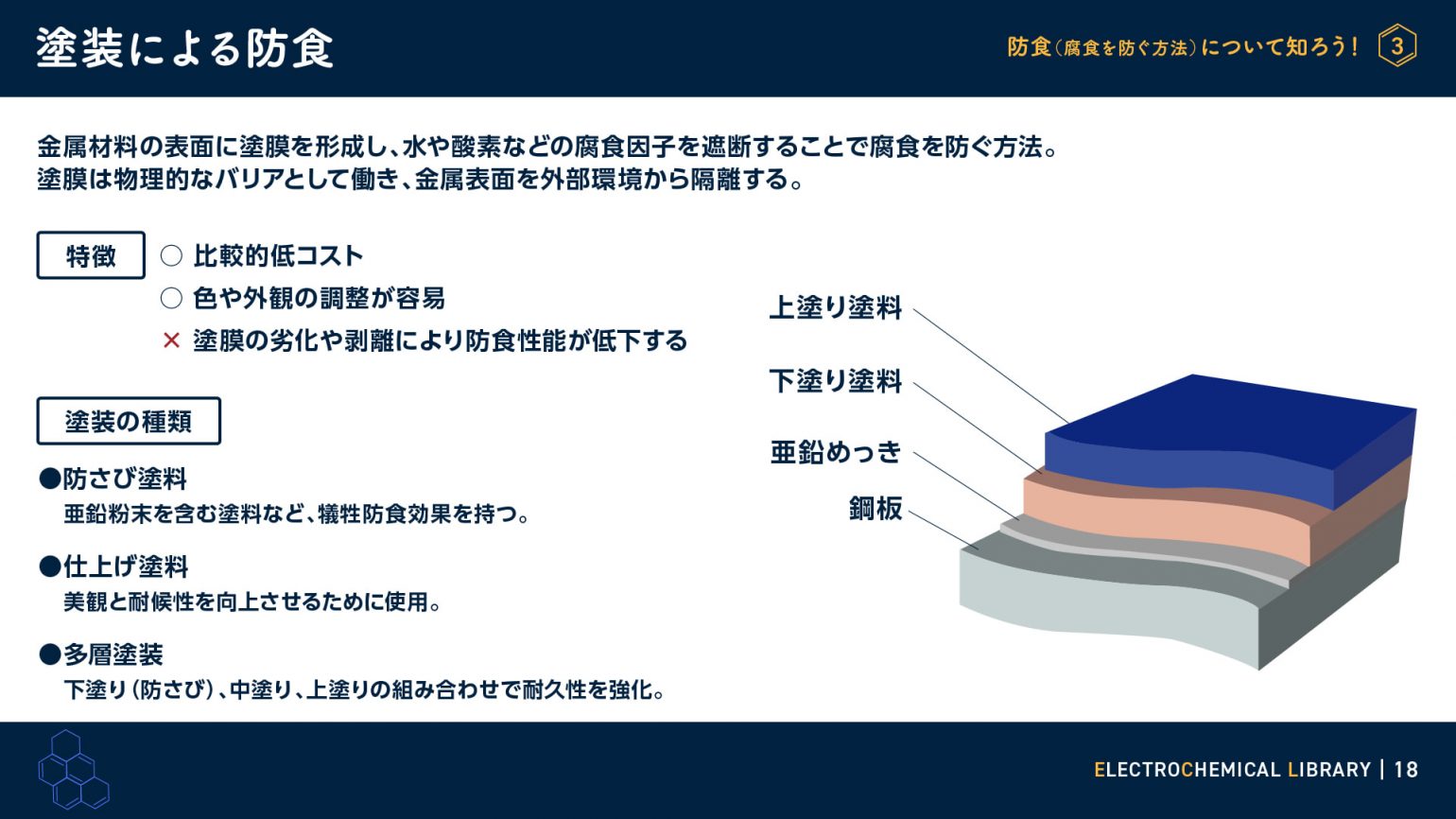 塗装やめっき、電気防食など、実際の産業で広く使われている防食技術を通して、金属を長く安全に使うための知識を学んでみませんか?